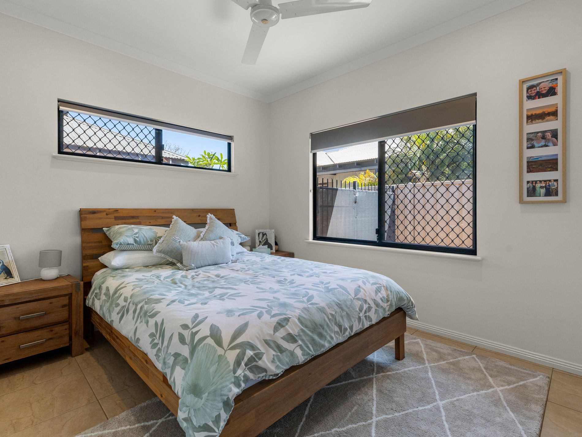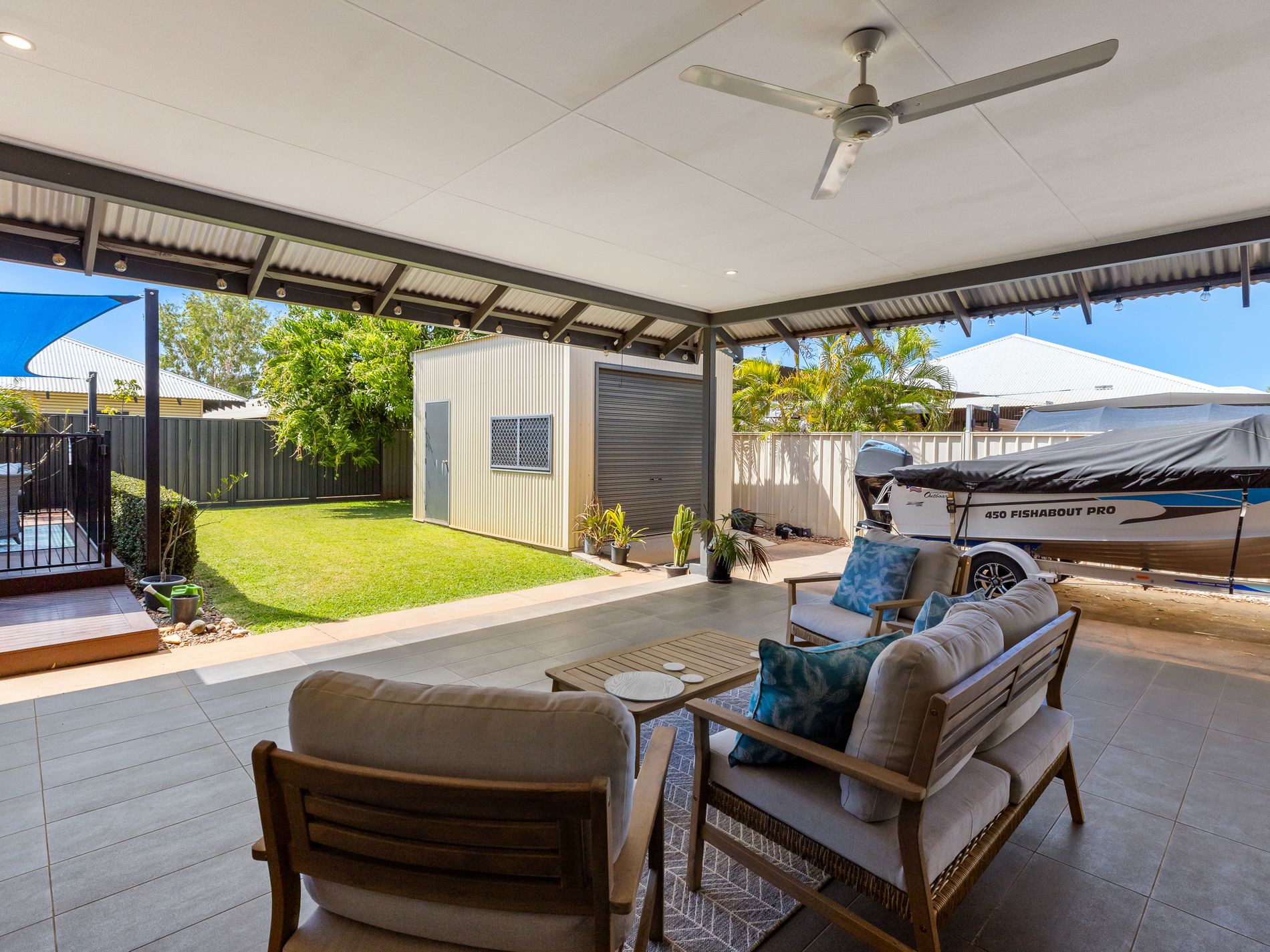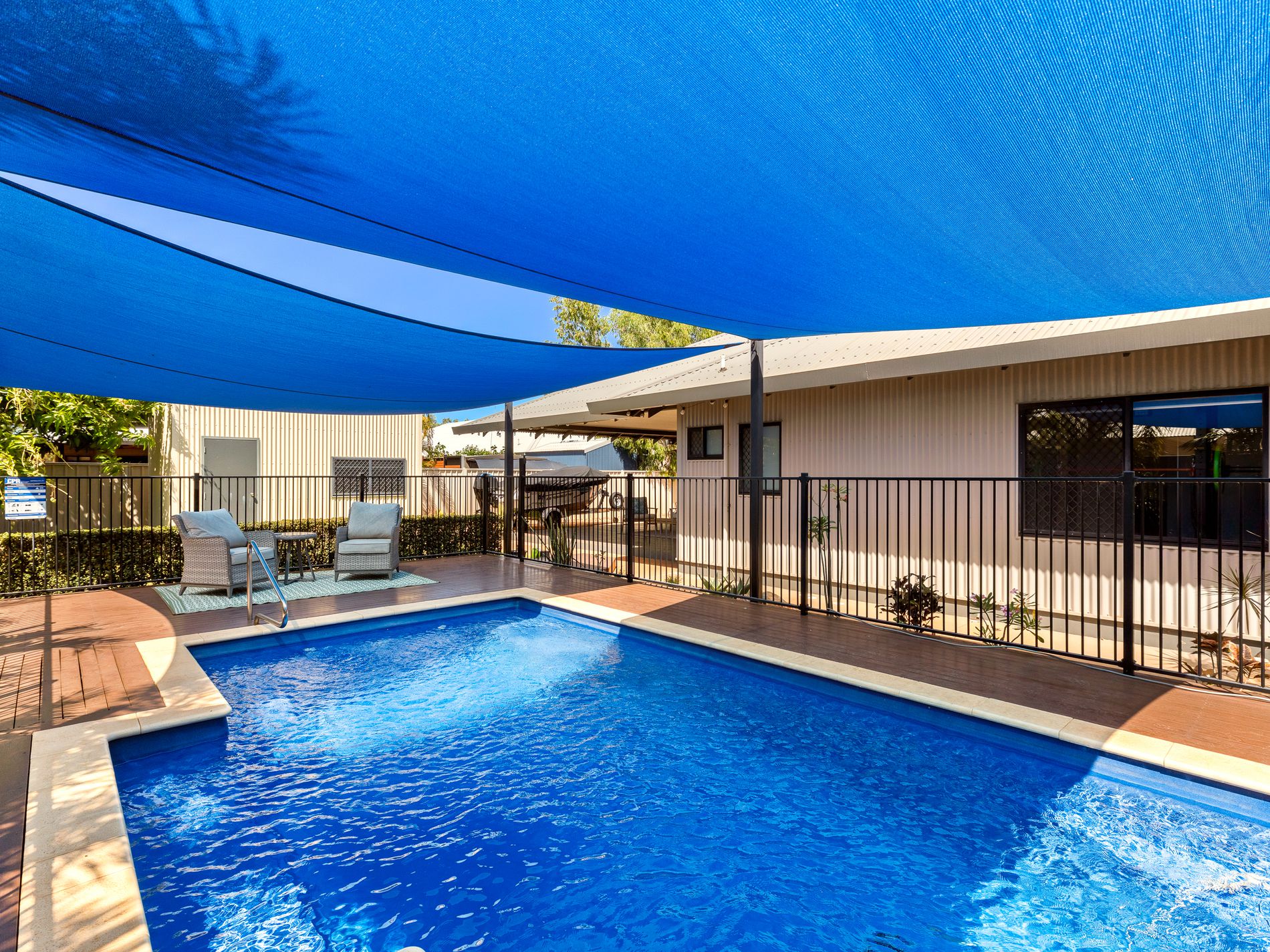 Outdoors is where this residence stands apart. The sparkling pool is framed by expansive timber decking and surrounded by established tropical gardens, with a mature mango tree adding a touch of Broome character.